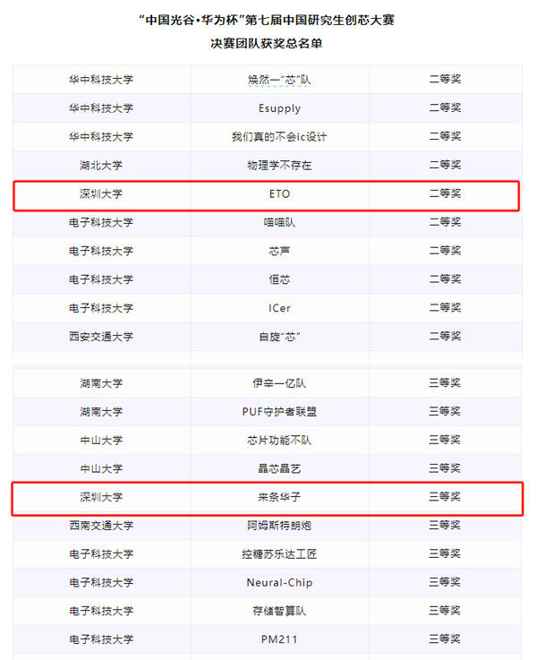 “中国光谷·华为杯”第七届中国研究生创“芯”大赛共有来自169所高校的858名指导教师、2783名参赛学生组成的970支队伍参赛,其中165支队伍入围线下决赛。决赛现场经过为期三天的精彩角逐,大赛团队奖项评选出16支一等奖团队,其中3支队伍获得本届创“芯”之星最高荣誉,另决出41支二等奖团队,107支三等奖团队,23名优秀指导教师奖,31个优秀组织单位。