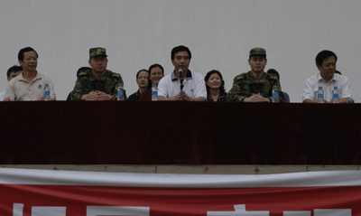 陶士平与部队首长检阅了同学们的军训成果。他代表学校对三团的老师和学生致以深切慰问,对预备役防化团的首长和教官表示衷心感谢。陶士平指出,大学生军训是国家的要求,是加强国防意识的要求,是保证强有力后备军的要求。中国人民解放军是一所特殊的大学,它以“政治合格、军事过硬、作风优良、保障有力”而闻名。通过军训能使同学们学到基本军事知识,以及中国人民解放军艰苦奋斗、坚韧不拔的优良作风。他希望同学们以饱满的热情投身到军训当中,不怕苦,不怕累,服从教官,团结互助,关爱他人。通过这次军训能够学习政治,学习待人处事,学会生活。陶士平说,军训是大学的第一课,同学们必须认真上好这一课,学习发扬军队的优良作风,圆满完成军训任务。最后,他祝同学们投身熔炉,百炼成钢。