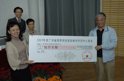 在欢快的乐曲声中,章校长和陈副校长为新增省级实验教学示范中心、2007年先进集体与先进个人颁发了奖金和奖牌。