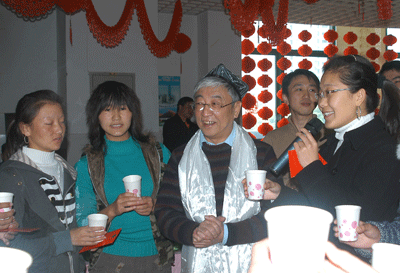 章必功、阮双琛、邢锋、陈思平还分别与在场师生一一碰杯,章必功与西藏学生碰杯时,文学院藏族学生四郎巴姆献上藏族祝酒歌《三杯酒》。藏族学生为校领导献上洁白的哈达,表达心中的感激和祝福。团年饭中间,新疆学生表演了民族舞蹈,藏族学生演唱歌曲《西藏之光》、《多快乐》,外国语学院大一学生陈晓丽一曲古筝独奏《战台风》更是赢得章必功校长“大珠小珠落玉盘”的称赞。