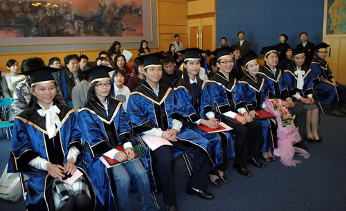 毕业典礼在庄严的国歌声中开始。陶一桃宣读了学校关于授予胡倩文等九名同学学士学位的决定。章必功为胡倩文等九名同学颁授毕业证书和学士学位证书,并与他们合影留念。