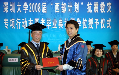 章必功致辞。他说,参加抗震救灾的志愿者同学,体现了特区青年的情怀、深大学生的崇高境界。他们的行为让08届毕业典礼完美。有了今天这个典礼,深大2008届毕业典礼与国家大事连接在一起。他代表学校对志愿者同学们表示由衷的敬意和感谢。他表示,九名同学很阳光、很精神,是深大学生的骄傲。他们经历了08年抗震救灾的大事,相信他们以后的人生将无所畏惧。他们自愿为灾区人民做贡献,值得师生们学习借鉴。希望他们到社会上坚持发扬抗震救灾精神,做人永远不要输,一生一世与高尚、真理同行,做九颗青松。最后,他祝愿志愿者同学们就业有个很好的岗位,在未来的征程有更大的成绩,有更好的前程。
