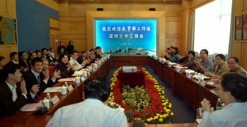 3月31日至4月2日,全国人大常委会委员、教育部原副部长吴启迪率教育部工作组来深圳对我市高等教育发展进行为期三天的调研。4月1 日下午,教育部工作组MK网页版登录入口调研汇报会在我校国际会议厅D厅举行。参加会议的教育部工作组成员有:全国人大常委会委员、教育部原副部长吴启迪,中山大学原党委书记李延保,教育部发展规划司副司长宋德民、高等教育司副司长刘桔、学位管理与研究生教育司副巡视员梁国雄、国际合作与交流司副司长沈阳、高等教育教学评估中心王战军,广东省科技厅副厅长雷朝滋。参加会议的市有关部门领导有:深圳市政府副秘书长黄国强、市教育局局长张宝泉。我校领导江潭瑜、章必功、邢苗、陶士平、陶一桃、阮双琛、邢锋、陈思平、李永华、李凤亮以及各学院院长和职能部门负责人参加汇报会。