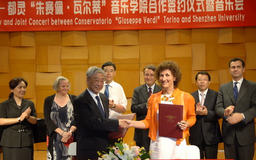 铂西安妮院长致辞。她代表都灵“朱赛佩?瓦尔蒂”音乐学院对深大师生表示感谢和问候。她说,今天的签约仪式暨音乐会象征着友谊与合作,两校的合作从今天开始。都灵“朱赛佩?瓦尔蒂”音乐学院一直以来把扩大对外交流合作作为很重要的工作来做。出于对音乐的热爱,我们希望进一步深入与深大的联系。她祝愿两校合作长久,并邀请章必功校长率团访问音乐学院。