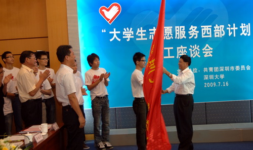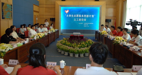 “到西部去、到基层去、到祖国最需要的地方去!”7月16日上午, “大学生志愿服务西部计划”义工座谈会在我校国际会议厅D厅举行,我校10名志愿者庄严宣誓。市委常委、市教育工委书记李意珍;市政府副秘书长,市抗震救灾对口支援工作领导小组前方指挥部总指挥,陇南市委常委、副市长张文;团市委书记刘燕,副书记张志华、赵嘉;市教育局副巡视员梁北汉;我校领导江潭瑜、陶一桃及我校“志愿服务西部计划” 赴地震灾区首批和第二批成员出席座谈会。