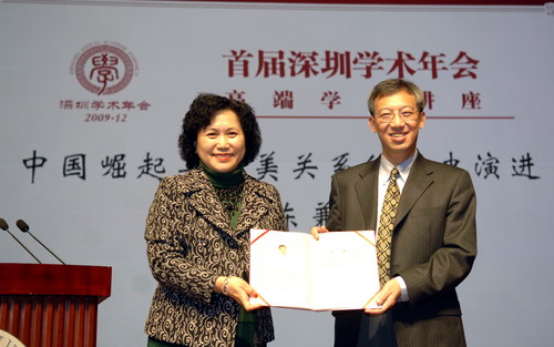 “中国的崛起是中国的大事,是中美关系的大事,也是世界的大事。”12月24日下午,美国康奈尔大学讲座教授陈兼应我校邀请,以“中国崛起与中美关系的历史演进”为题,在国际会议厅为广大师生作学术演讲。这是由深圳市委宣传部、深圳市社科联、深圳报业集团等单位联合主办的首届深圳学术年会三场高端学术讲座的最后一场,国际会议厅内座无虚席。讲座由副校长李凤亮主持,校党委副书记陶一桃致欢迎辞并向陈兼颁发特约教授证书。
