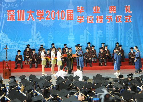 毕业典礼暨学位授予仪式在雄壮的国歌声中开始。李永华宣读了学校授予2010届第二批本科生学士学位的决定。校长章必功为获得学士学位的同学一一颁发证书。