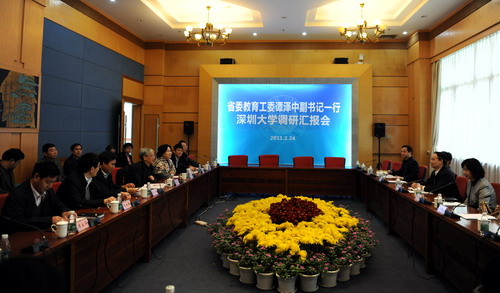 2月24日,广东省委教育工委副书记、省教育厅党组副书记谭泽中,省教育厅人事处处长那佳、副处长林日团,干部处处长朱伟新、师资管理处处长卢羡文一行到我校调研人事制度改革情况。校领导章必功、陶士平、陶一桃、阮双琛、邢锋、李永华出席在国际会议厅D厅举行的调研汇报会。当天下午,调研团还与我校教职员工代表进行了座谈交流。
