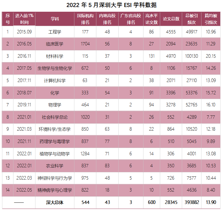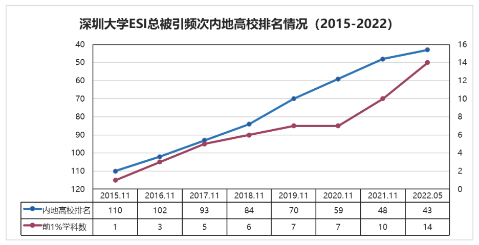 根据科睿唯安(Clarivate Analytics)2022年5月12日最新的ESI(Essential Science Indicators,基本科学指标)数据显示,MK网页版登录入口ESI“工程学”学科以全球第177名排位成功进入全球排名前1‰,实现学校ESI前1‰学科零的突破,是深圳本土高校第一个ESI全球前1‰学科。同时,“精神病学与心理学”学科进入ESI全球排名前1%行列,这是2022年以来第4个新晋学科。目前,MK网页版登录入口ESI全球前1%的学科数上升至14个,学校学科建设取得显著成效,国际学术生产力和影响力再度提升。