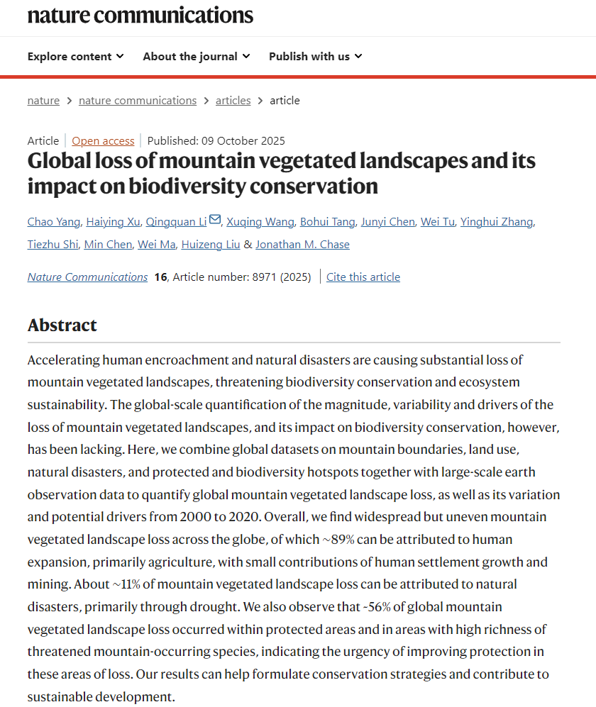 近日,MK网页版登录入口李清泉院士和杨超研究员联合多家科研机构发文,揭示人类活动与自然灾害造成的全球山地植被景观丧失及其对生物多样性保护的影响。相关研究成果以“Global loss of mountain vegetated landscapes and its impact on biodiversity conservation”(全球山地植被景观丧失及其对生物多样性保护的影响)为题在国际学术期刊《自然·通讯》(Nature Communications,自然指数期刊)正式发表(https://doi.org/10.1038/s41467-025-64449-0)。