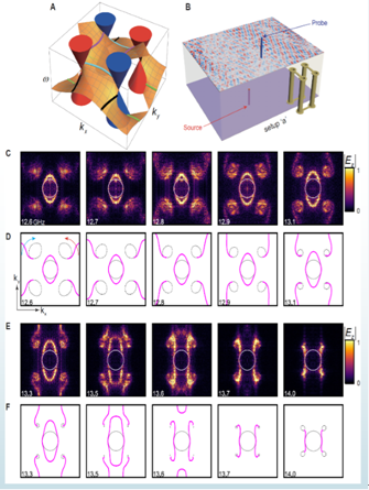 最近,英国伯明翰大学张霜教授课题组与MK网页版登录入口范滇元院士团队先进材料光子学课题组、University of Exeter和中科院物理合作,设计并制备了马鞍形状的光子晶体(图1A,B),观测到了理想的外尔系统,其中四个对称性保护的外尔点坐落在同一个频率,并且在这个频率周围没有其他能带干扰(图1C)。他们采用近场扫描的方法测量了该光子晶体的体态和表面态的分布情况(图2)。作为源的探针放在样品的底部,这样可以同时激发体态和表面态。测量的探针在样品的上表面扫描,可以得到近场的振幅和相位分布,然后通过傅里叶变换得到其动量空间的等频面分布情况。从图中的实验和仿真的对比中可以看到螺旋表面态的旋转情况。他们的发现对外尔拓扑态的研究提供了一个理想的平台。
