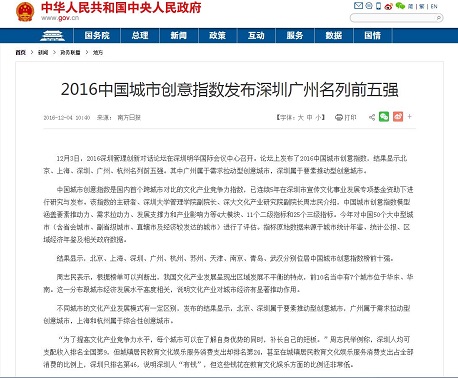 2016年12月3日,2016中国城市创意指数(CCCI2016)在第二届深圳管理创新对话论坛上发布后,受到深圳卫视、《中国质量报》、《南方日报》、《南方都市报》、《深圳特区报》、中国财经网、新华网、新浪网、搜狐网、网易网、腾讯网、东方网等多家媒体报道和转载。特别值得一提的是,中华人民共和国中央人民政府网站与广东省人民政府网站等权威网站也转载了相关报道。