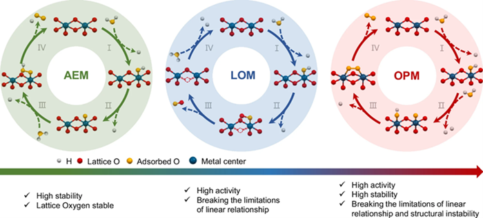 图1. AEM、LOM、OPM反应路径及其特点的示意图。