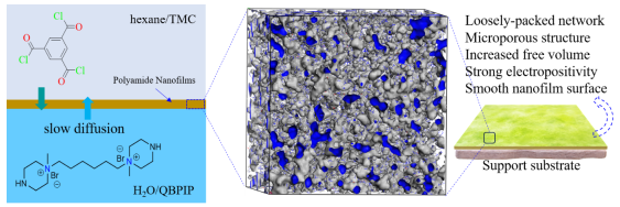 锂在清洁能源技术中发挥着不可或缺的作用,盐湖卤水蕴藏着全球约70%的锂资源,盐湖锂资源的开发具有重大战略意义。相较于传统分离方法,纳滤技术因较低操作压力等优势而受到青睐。通过单体界面聚合(IP)形成的聚酰胺(PA)纳滤(NF)膜广泛应用于盐湖卤水锂镁分离。但由于盐湖卤水中的镁/锂比相对较高,传统NF膜存在渗透性和选择性的相互制约关系,影响其整体分离性能。NF膜的分离层电荷密度和孔径调节是锂镁分离性能提升的重要因素。因此,构建新型的分离层界面聚合单体,从结构角度改善纳滤膜的分离性能,是提升锂镁分离效果的一个重要的研究方向。