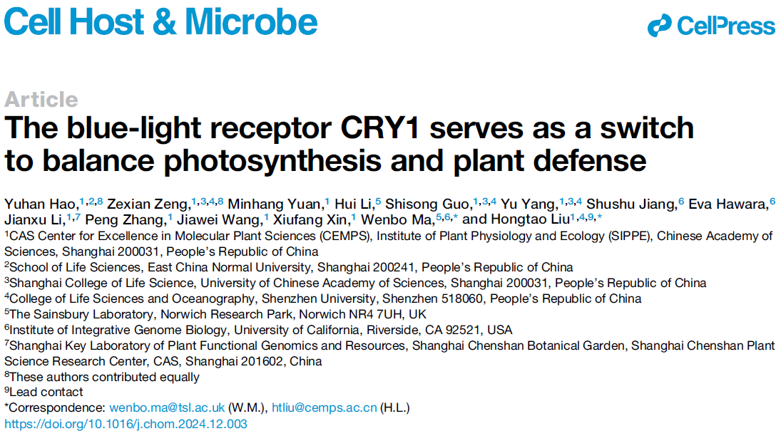 2024年12月27日,MK网页版登录入口生命与海洋科学学院刘宏涛教授团队和英国The Sainsbury Laboratory(TSL)研究所马文勃教授合作,在Cell Host & Microbe在线发表了题为The blue-light receptor CRY1 serves as a switch to balance photosynthesis and plant defense的研究论文。研究表明,拟南芥蓝光受体隐花色素1(CRY1)不仅介导蓝光打开气孔,还能在病原菌入侵时帮助气孔迅速关闭,参与调控气孔免疫过程。同时,CRY1还调控了PTI免疫的多个方面,作为一个“双控开关”平衡了植物的光合和免疫。