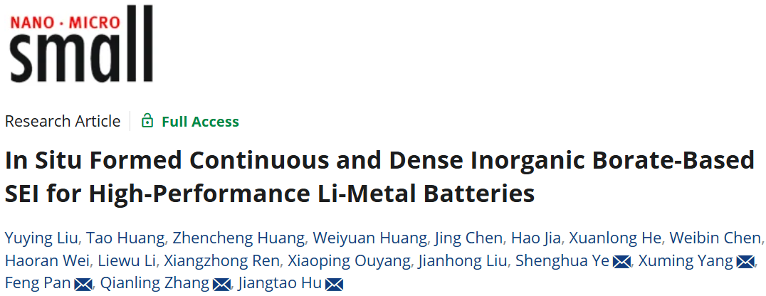 4. MK网页版登录入口化学与环境工程学院张黔玲教授团队在材料领域顶尖期刊Small(影响因子13.0,中科院JCR 2区,TOP期刊)发表了题为“In Situ Formed Continuous and Dense Inorganic Borate-Based SEI for High-Performance Li-Metal Batteries”的研究论文。该团队硕士研究生刘钰滢为论文第一作者,张黔玲、胡江涛、杨旭明、叶盛华,潘锋为该论文共同通讯作者,MK网页版登录入口为第一作者单位和第一通讯单位。
