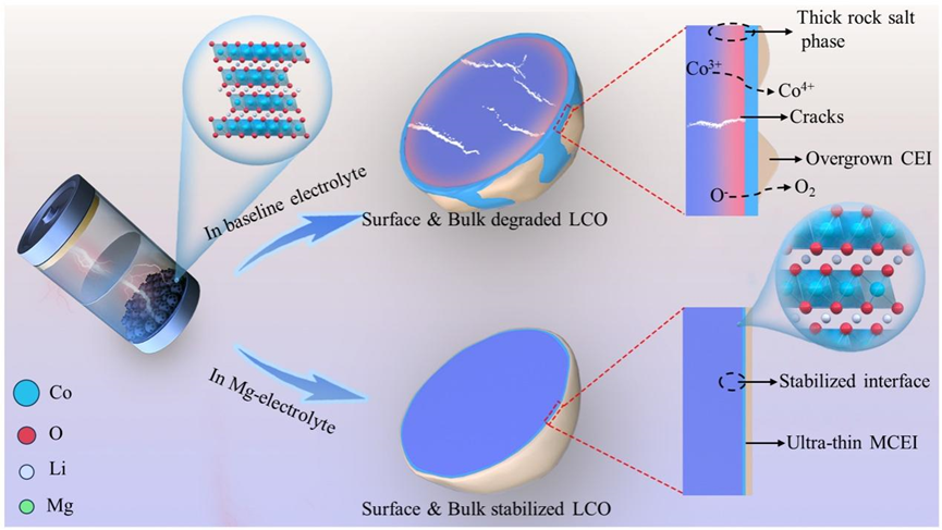 在该项工作中,通过加入Mg(TFSI)2作为电解质添加剂,构建具有物理和化学稳定性的正极-电解质界面(MCEI)。在电池活化过程中,MCEI在LCO表面快速生长形成,并在长期循环过程中始终保持2 nm的厚度。通过系列高分辨测试表征,Mg不仅仅参与了MCEI的形成和构建,而且能够嵌入LCO的表面晶格。因此,这种超薄且机械稳定 的MCEI能够显著抑制界面副反应、表面相重构、颗粒开裂、钴溶解,使得Li||LCO纽扣电池在4.5 V充电截止电压下循环200次后容量保留88.13%,Ah级Graphite||LCO软包电池300次循环后容量保留90.4%。