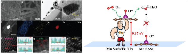该工作合成了铁纳米颗粒@碳纳米管负载的锰、铁双单原子位点催化剂,并证明了在碳纳米管壁上的Mn单原子位点与限域在碳纳米管空腔内的铁纳米颗粒存在电子授受作用,引起Mn单原子位点的姜-泰勒畸变,激活了Mn单原子位点的ORR活性。