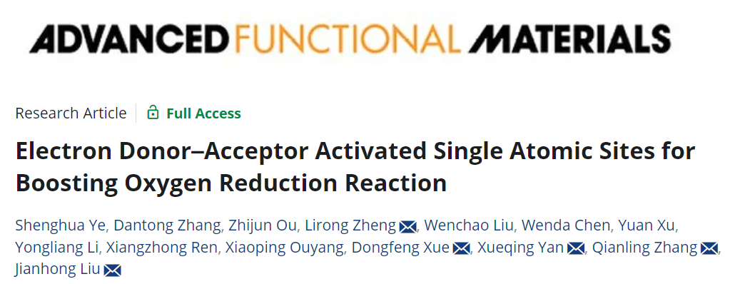 2、MK网页版登录入口张黔玲教授团队在期刊Advanced Functional Materials上发表题为“Electron Donor–Acceptor Activated Single Atomic Sites for Boosting Oxygen Reduction Reaction”的研究论文,MK网页版登录入口叶盛华研究员、中国科学院深圳先进技术研究院张丹彤博士是共同第一作者,MK网页版登录入口刘剑洪和张黔玲教授、北京大学颜学庆教授、电子科技大学(深圳)高等研究院薛冬峰教授以及中科院高能物理研究所郑黎荣研究员为共同通讯作者。