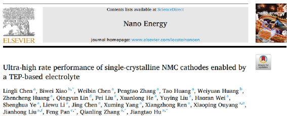 2. MK网页版登录入口化学与环境工程学院张黔玲教授团队在材料领域顶尖期刊Nano Energy(影响因子16.8,中科院JCR 1区)发表了题为“Ultra-high rate performance of single-crystalline NMC cathodes enabled by a TEP-based electrolyte”的研究论文。该团队硕士研究生陈伶俐为论文第一作者,张黔玲、胡江涛、北京大学潘锋教授、有研(广东)新材料技术研究院肖必威教授为该论文通讯作者,MK网页版登录入口为第一作者单位和第一通讯单位。