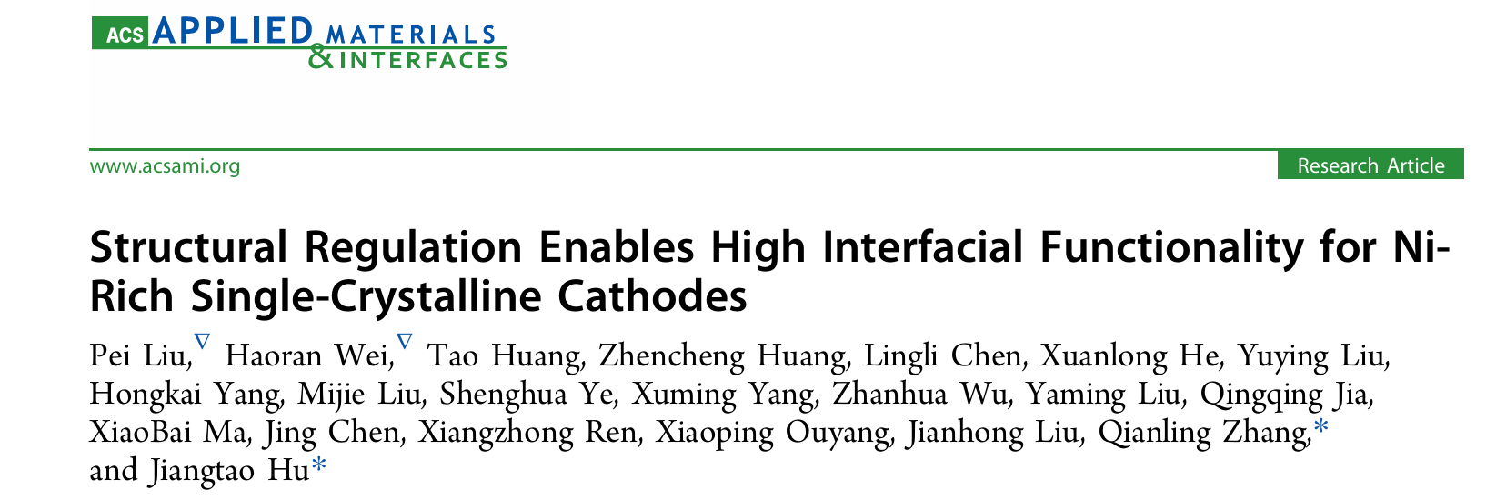 7. MK网页版登录入口化学与环境工程学院张黔玲教授团队在期刊ACS Applied Materials & Interfaces(影响因子8.3,中科院JCR2区,TOP期刊)上发表了题为“Structural Regulation Enables High Interfacial Functionality for Ni-Rich Single-Crystalline Cathodes”的论文。该团队硕士研究生刘珮和魏浩然为共同第一作者,张黔玲和胡江涛为共同通讯作者。MK网页版登录入口为唯一作者单位和唯一通讯单位。