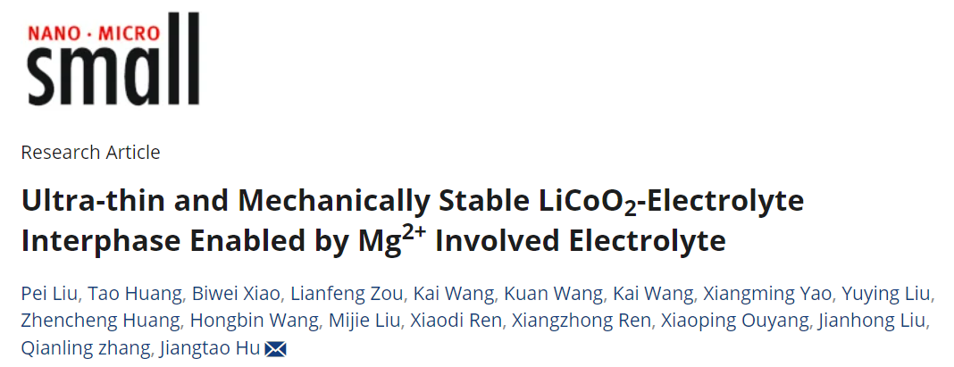 5. MK网页版登录入口化学与环境工程学院张黔玲教授团队在材料领域顶尖期刊Small(影响因子13.0,中科院JCR2区,TOP期刊)发表了题为“Ultra-thin and Mechanically Stable LiCoO2-Electrolyte Interphase Enabled by Mg2+ Involved Electrolyte”的研究论文。该团队硕士研究生刘珮和黄涛为论文共同第一作者,MK网页版登录入口胡江涛副教授为该论文通讯作者。