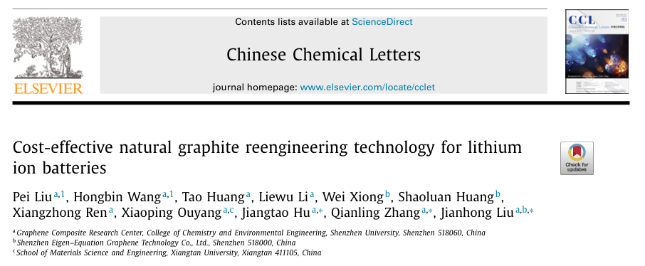 6. MK网页版登录入口化学与环境工程学院张黔玲教授团队在材料领域顶尖期刊Chinese Chemical Letters(影响因子6.78,中科院JCR1区)发表了题为“Cost-effective natural graphite reengineering technology for lithium ion batteries”的研究论文。该团队硕士研究生刘珮和黄涛为论文共同第一作者,胡江涛、张黔玲、刘剑洪为该论文通讯作者。