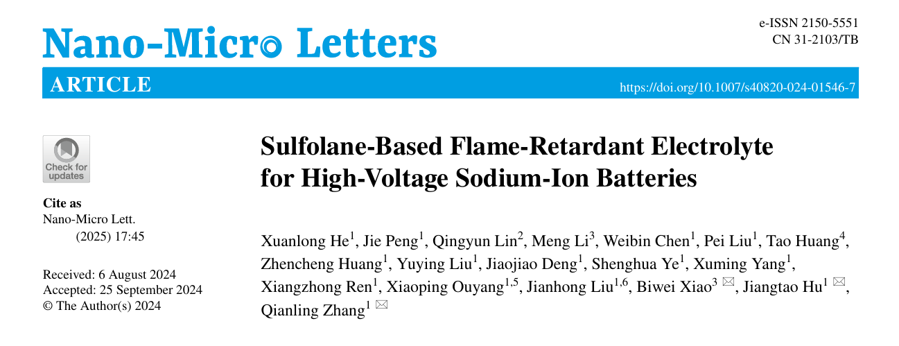 3. MK网页版登录入口化学与环境工程学院张黔玲教授团队在材料领域顶尖期刊Nano-Micro Letters(影响因子31.6,中科院JCR 1区,TOP期刊)发表了题为“Sulfolane‑Based Flame‑Retardant Electrolyte for High‑Voltage Sodium‑Ion Batteries”的研究论文。该团队硕士生何铉龙为论文第一作者,MK网页版登录入口张黔玲教授、胡江涛副教授、有研(广东)新材料技术研究院肖必威教授为该论文共同通讯作者,MK网页版登录入口为第一作者单位和第一通讯单位。