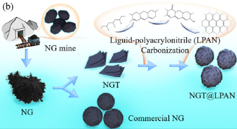 在该项工作中,开发了一种独特的多功能液态聚丙烯腈(LPAN)作为碳源,用于天然石墨(NGT)的回收。利于LPAN聚合物的多官能团结构,在一次NGT颗粒表面形成一层致密的包覆层,对碳化后的缺陷进行表面改性和修复,构建出具有低表面积/高振实密度的二次石墨颗粒。该材料在首次放电比容量(400.33mAh/g)和半电池库伦效率(92.07%)上表现出优异的电化学性能。与NMC532(Ni:Mn:Co = 5:3:2)阴极组装全电池表现出优异的循环性能,在1C电流密度下循环500圈,其容量保持率为84.32%。