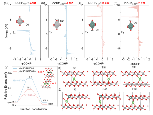 本工作通过掺杂Y元素抑制了单晶富镍层状正极材料的晶格氧释放,构建了均匀的CEI层,有效防止了循环过程中从表面到体相的严重结构降解。该技术的亮点在于掺杂Y后的SC-NMC83阴极材料通过强Y-O键稳定了结构,SC-NMC83-Y表现出更强的可逆性,并有更加均匀的CEI层。通过Y的掺入,拓宽了Li+在正极材料中的扩散路径,提高了锂离子的扩散系数,降低了锂离子的迁移能垒,成功的将锂离子的迁移能垒从0.67 eV降低至0.36 eV。其中SC-NMC83-Y的ICOHP值为-2.329,低于SC-NMC83的-2.181,表明YO6的键强强于NiO6。这项工作对Y掺杂的深入理解有助于设计出稳定的高镍单晶NMC正极材料,用于高能、高安全性锂电池。