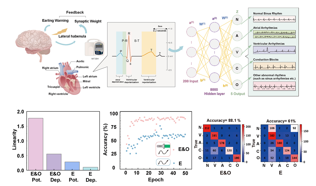 神经形态计算系统通过整合存储和计算功能,提供了解决传统冯·诺依曼架构局限性的方法。光电突触晶体管能够响应光信号和电信号,实现多功能操作并具有低功耗。然而,短数据保持时间和低处理效率等挑战仍然存在。本研究提出了一种光电突触晶体管,利用二硫化钼、二维Zn2(bim)4和金纳米颗粒分别作为半导体、隧穿层和浮栅材料。通过调整隧穿层的厚度,可以调节的电荷阻挡能力,从而改善长期数据保持能力。二硫化钼的光电特性和金纳米颗粒的电荷捕获能力使得该晶体管能够模拟突触行为,如突触后电流、长期增强以及从短期记忆到长期记忆的转换。该器件还可以集成到人工神经网络中,用于智能医疗应用,通过光电双模刺激在心电图分类中实现了88.1%的准确率。此项研究得到国家自然科学基金、英国皇家化学会、射频异质异构集成全国重点实验室自主课题、广东省基础与应用基础研究基金、深圳市科创局、MK网页版登录入口与台北科技大学2024年合作研究的资助。