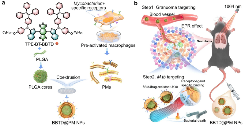 本论文详细阐述了BBTD@PM仿生纳米用于肺结核一体化诊疗的标准化方法(图1),内容主要包括以下关键步骤:(1)NIR-II聚集诱导发光分子TPE-BT-BBTD的合成;(2)巨噬细胞的预激活处理;(3)预激活巨噬细胞膜的提取与纯化;(4)基于共挤压法制备BBTD@PM仿生纳米;(5)活体小鼠肺结核的NIR-IIb荧光成像及体内成像引导的光热抗结核分枝杆菌治疗。值得注意的是,这种具有高诊疗性能与精准靶向特性的NIR-II聚集诱导发光一体化仿生纳米诊疗平台,还可拓展应用于其他病原体相关疾病的诊疗当中。