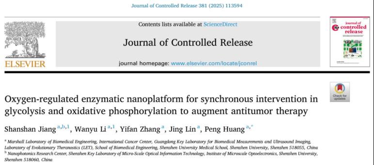 近日,MK网页版登录入口医学部生物医学工程学院黄鹏特聘教授团队以封面论文在药剂学国际权威期刊Journal of Controlled Release(影响因子10.5,中科院一区,TOP期刊)上发表了题为“Oxygen-regulated enzymatic nanoplatform for synchronous intervention in glycolysis and oxidative phosphorylation to augment antitumor therapy”的研究论文。医学部博士后江珊珊和硕士研究生李婉钰为共同第一作者,教授黄鹏为通讯作者,MK网页版登录入口为独立完成单位。团队所在的生物医学工程学科属于广东省优势重点学科。