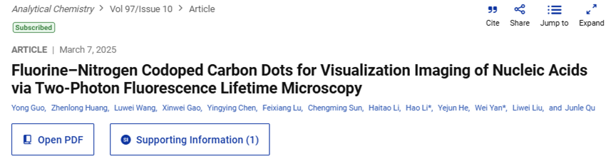 (2)题为“Fluorine-Nitrogen Codoped Carbon Dots for Visualization Imaging of Nucleic Acids via Two-Photon Fluorescence Lifetime Microscopy”的研究论文在Analytical Chemistry上发表。以2,4-二氟苯甲酸和甘氨酸为原料成功制备氟-氮共掺杂碳点(F-NCDs),以其为探针通过双光子荧光寿命显微镜对核酸进行可视化成像研究。郭勇为该论文的第一作者,严伟和李灏为该论文的通讯作者,MK网页版登录入口为第一完成单位和通讯作者单位。