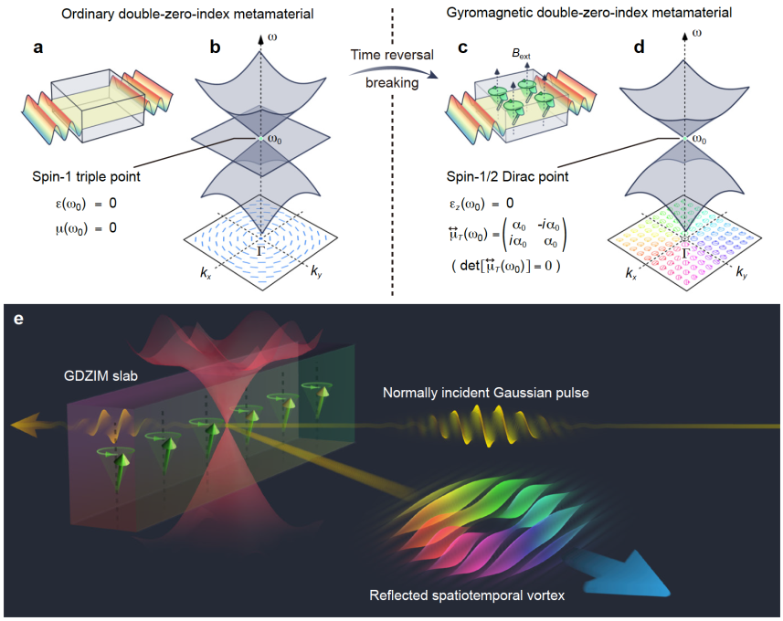 图1. 传统双零折射率超材料与旋磁双零折射率超材料对比,及利用旋磁双零超材料产生时空光涡旋