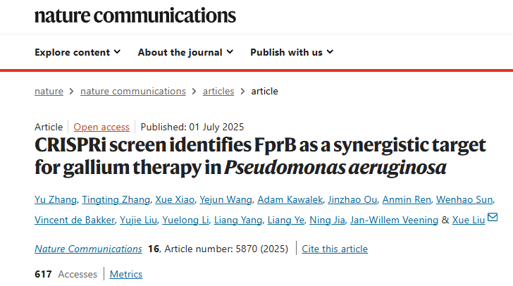 2025年7月1日,MK网页版登录入口医学部基础医学院及卡尔森国际肿瘤中心刘雪副教授团队在Nature Communications上发表了题为“CRISPRi screen identifies FprB as a synergistic target for gallium therapy in Pseudomonas aeruginosa”的研究论文。该团队基于CRISPRi-seq技术,系统揭示了铜绿假单胞菌对镓治疗敏感性的遗传基础,确定了FprB(铁氧还蛋白-NADP+还原酶)为镓治疗协同作用的关键靶点。医学部副研究员章宇为第一作者,刘雪为唯一通讯作者,博士后张婷婷、已毕业硕士生肖雪、副教授汪业军等共同参与了本研究,MK网页版登录入口为第一完成单位。