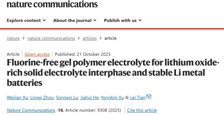 近日,MK网页版登录入口化学与环境工程学院田雷副教授课题组在Nature Communications期刊上发表题为“Fluorine-free gel polymer electrolyte for lithium oxide-rich solid electrolyte interphase and stable Li metal batteries”的研究论文。团队成员22级硕士研究生许伟健为论文第一作者,田雷副教授为论文独立通讯作者,MK网页版登录入口为第一作者单位及通讯单位。