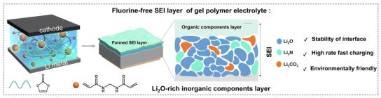 构建稳定的固态电解质界面(SEI)是提升锂金属电池性能的关键核心。当前,利用氟化组分形成富含氟化锂(LiF)的SEI是提升循环性能的主流策略,但其相关的成本及环境影响仍存在问题。该研究提出了一种无氟准固态聚合物电解质,其生成的含O/N杂化SEI具有改善的界面稳定性及Li⁺传输动力学。这种独特的SEI结构优先引导锂沿(200)晶面沉积,同时提升电荷转移效率。当应用于Li||LiNi0.8Co0.1Mn0.1O2全电池时,该无氟凝胶聚合物电解质在3 C倍率下经过800次循环后容量保持率达84.7%。与传统的含氟聚合物电解质相比,该研究报道的无氟凝胶聚合物电解质体系展现出更优的高倍率性能。工作不仅提供了一种高性能、环境友好的电解质设计方案,也为下一代固态锂金属电池的材料工程提供了新的思路。
