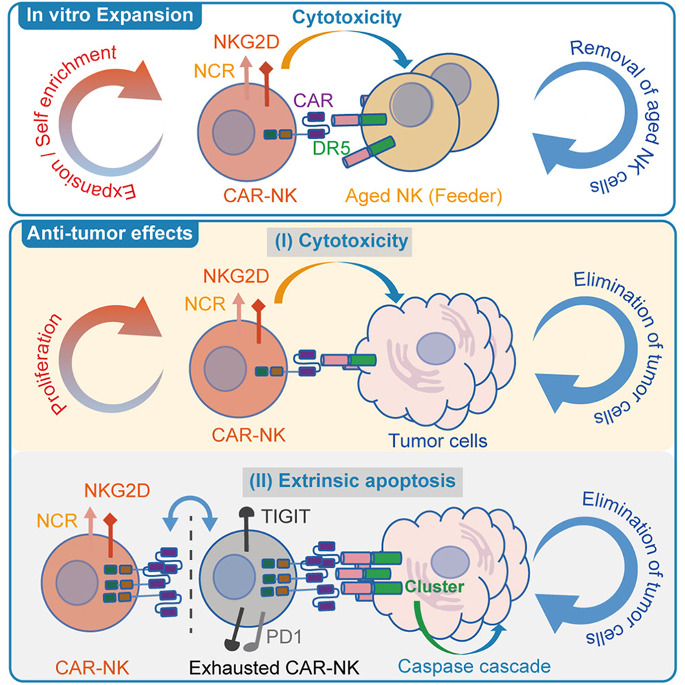 死亡受体5(DR5)在多种恶性肿瘤细胞中呈现选择性高表达,因而被视为是一个有潜力的抗肿瘤药物治疗靶点。然而,现有的在研疗法过度依赖该靶点介导的细胞凋亡信号,很容易因癌细胞的固有的或治疗过程中获得的抗凋亡机制而影响疗效。为此,研究团队基于对靶点生物学与免疫治疗机制的深入理解,设计出一款新型DR5靶向治疗技术——DR5 CAR-NK细胞疗法。