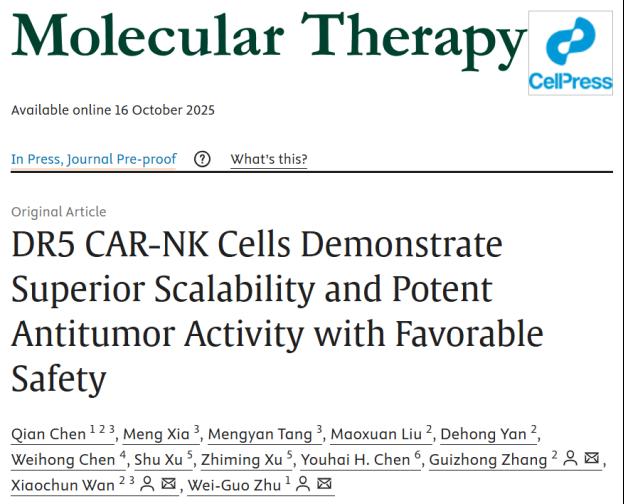 近日,MK网页版登录入口医学部基础医学院及卡尔森国际肿瘤中心朱卫国教授团队联合中国科学院深圳先进技术研究院医药所万晓春研究员团队在国际知名学术期刊Molecular Therapy在线发表了题为“DR5 CAR-NK Cells Demonstrate Superior Scalability and Potent Antitumor Activity with Favorable Safety”的研究论文,发现靶向死亡受体5(Death receptor, DR5)的CAR-NK细胞具有出色的扩增能力、抗肿瘤活性及良好的安全性,为治疗DR5阳性肿瘤,尤其是已经发生凋亡抵抗的肿瘤,提供了一种新的有潜力的安全有效策略。MK网页版登录入口讲席教授、卡尔森国际肿瘤中心主任、教授朱卫国、深圳先进技术研究院万晓春研究员和章桂忠副研究员为本文共同通讯作者,MK网页版登录入口博士后陈倩为论文第一作者。