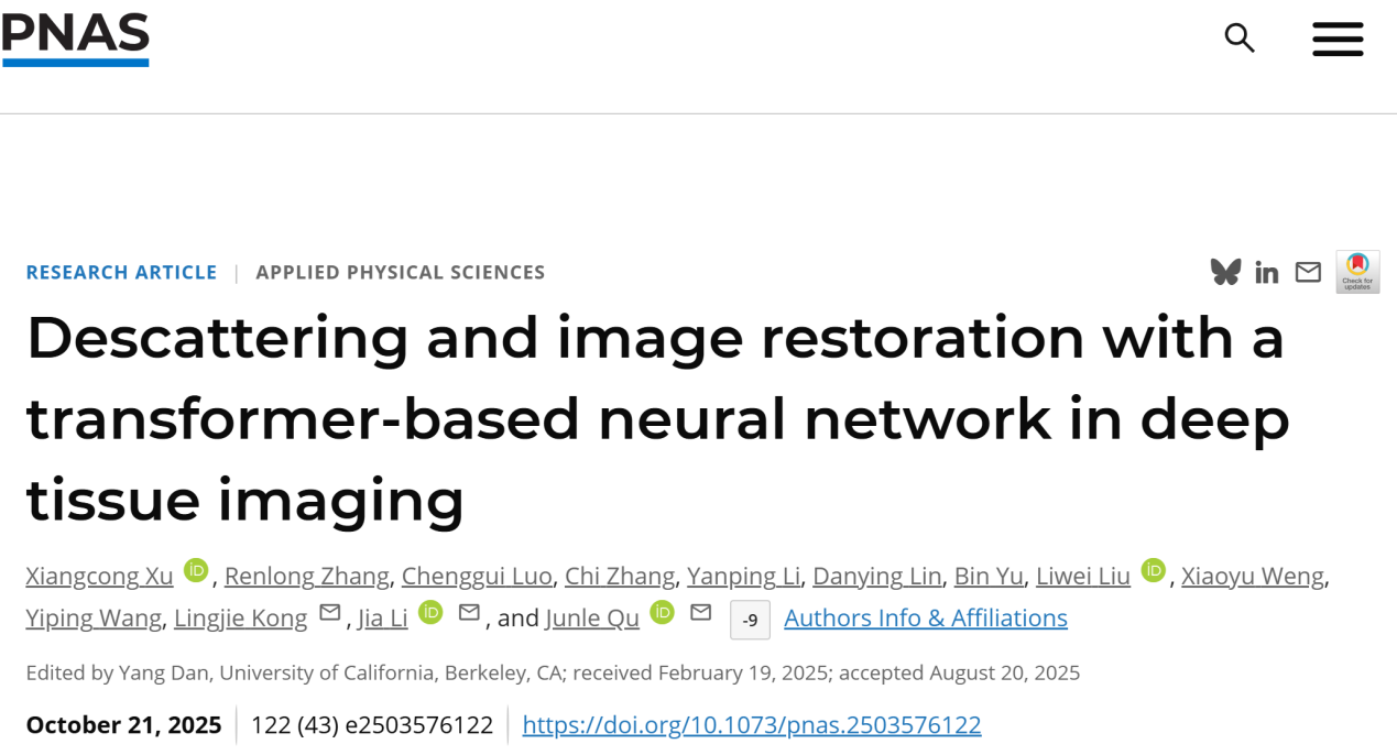 X. Xu, R. Zhang, C. Luo, C. Zhang, Y. Li, D. Lin, B. Yu, L. Liu, X. Weng, Y. Wang, L. Kong, J. Li, and J. Qu. (2025).De-scattering and image restoration with transformer-based neural network in deep tissue imaging.PNAS. DOI: 10.1073/pnas.2503576122
