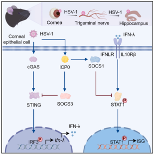 I型单纯疱疹病毒(HSV-1)是一种广泛存在的病毒,常引起口腔疱疹,也可通过眼睛角膜感染潜入三叉神经并最终扩散至大脑,引发疱疹性脑炎及其它中枢神经系统疾病。然而,HSV-1突破角膜天然免疫屏障传播至中枢神经系统的作用机制尚不清楚。研究团队发现,HSV-1利用其“间谍蛋白”ICP0,在角膜上皮细胞中激活了两个“破坏分子”细胞因子信号抑制因子1(SOCS1)和SOCS3。SOCS3负责摧毁天然免疫系统的“警报器”干扰素基因刺激因子(STING),从而阻断III型干扰素(IFN-λ)产生。SOCS1则干扰了IFN-λ抗病毒免疫信号的执行,使细胞无法建立防御状态。这两者联手为病毒打开了“绿色通道”,使其得以逃逸并在大脑中复制。重要的是,通过使用STING激动剂或直接补充IFN-λ,可以重新激活角膜的免疫防御,有效阻断病毒向大脑传播,为预防和治疗角膜病毒感染及病毒诱导的中枢神经系统疾病提供了新策略。