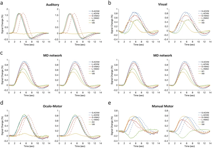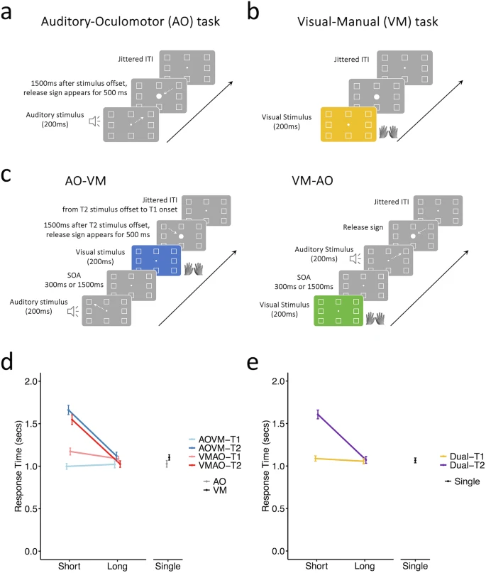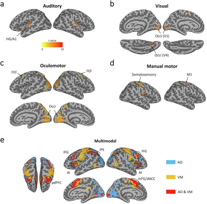 研究采用经典的心理不应期实验范式,其中两个任务分别为根据不同声音做出眼动反应和根据不同颜色做出手指按键反应(图1a-c)。在行为上,研究者观察到经典的心理不应期效应,即在双任务重叠(干扰)条件下,对第二个任务的反应被显著推迟,反映出在双任务条件下的序列加工模式(图1d, e)。对单任务脑激活数据进行分析,研究者定位出了不同加工阶段的脑区/网络,其中包括在两个任务中模态特异的听觉感知、视觉感知脑区和眼动、手指运动脑区,以及多模态的中央加工脑区。该中央加工脑区和之前为研究者所熟知的支持完成多重任务需求的网络高度重合(图2)。